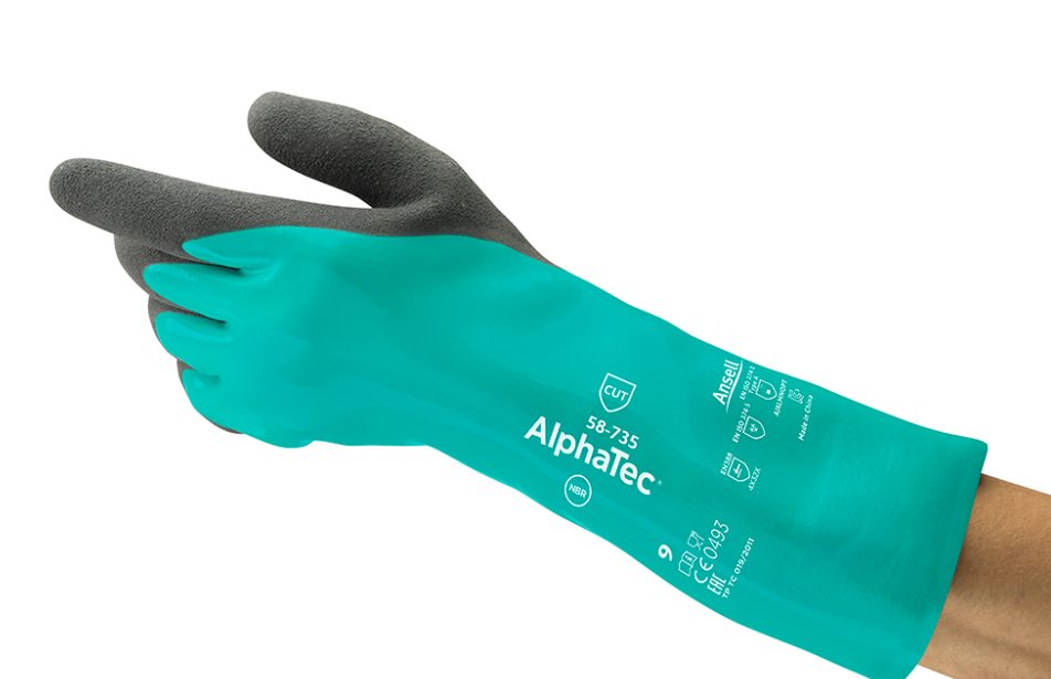 •Specialized protection: AlphaTec 58-735 chemical gloves’ nitrile barrier protects against common chemicals
