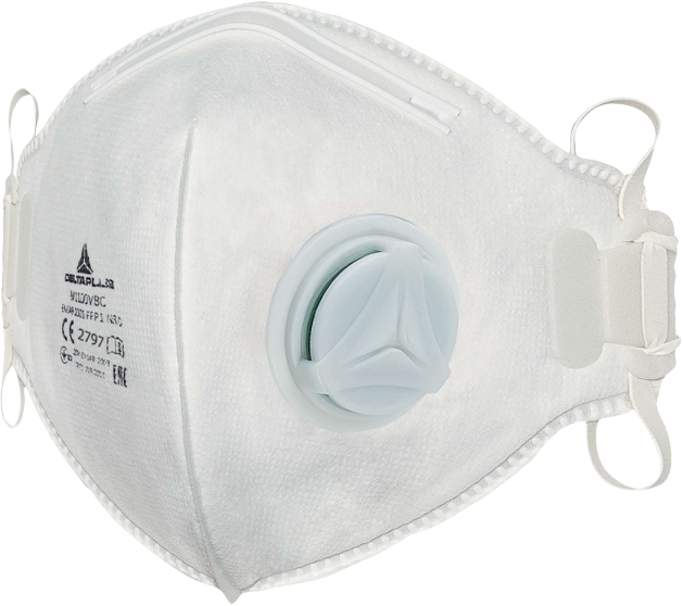 Box of 10 simple and efficient P1 disposable respirator masks, vertically foldable, with valve for optimised breathing comfort.