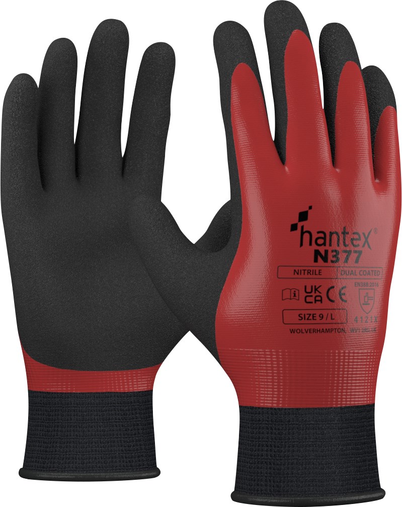 N377 HANTEX – dual nitrile coated general handling glove that is perfect for especially wet or oily applications £2.29/pair sold in packs of 10