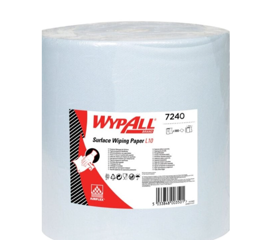 WypAll® L10 7240 is an extra-wide, 1-ply blue jumbo wiping roll designed for light-duty surface cleaning across industrial and food-handling environments. It features strong, absorbent Airflex™ base sheet technology and is certified for food contact, making it both effective and safe for hygiene-critical tasks.